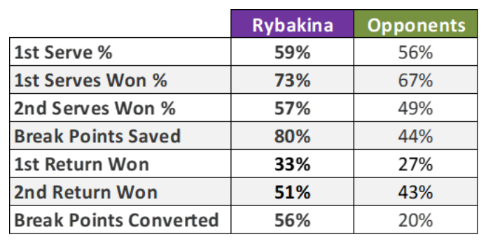 From her quarterfinal match through the final, she not only hit more winners than opponents (+6%), but she also made fewer errors (-2%). This results in a net differential of 8% in Rybakina’s favor.
